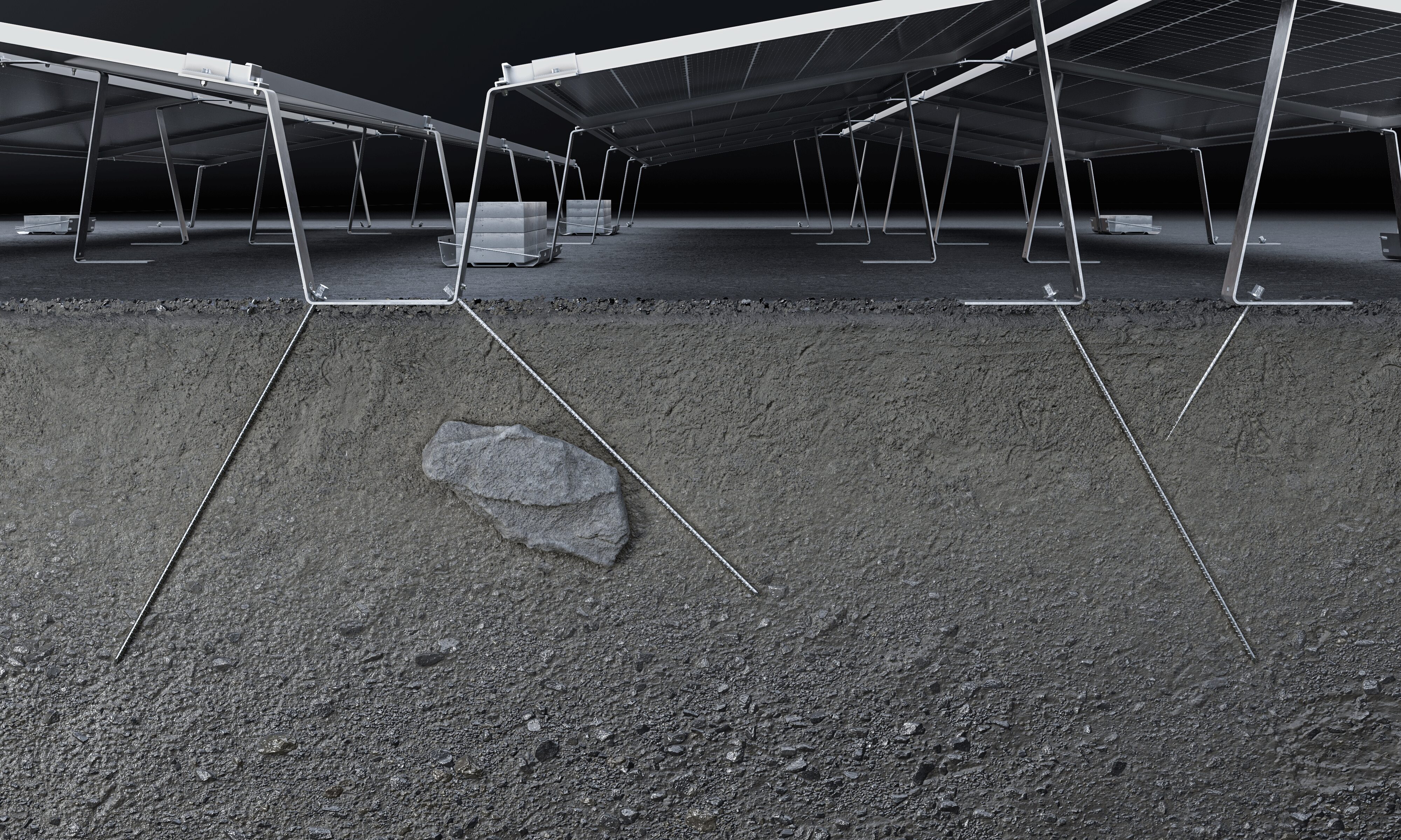 Nicht jeder Standort erlaubt klassische Rammfundamente – etwa auf Deponien, in felsigem Untergrund oder bei kleineren Projekten. Genau hier setzt Compactground GS an. Das Freiflächensystem nutzt feuerverzinkte Erdnägel mit Außengewinde, die bei Hindernissen flexibel neu gesetzt werden können. Zusätzlich stehen Ballastwannen zur Verfügung. Damit lässt sich die Lagesicherung optimal an die Bedingungen vor Ort anpassen.