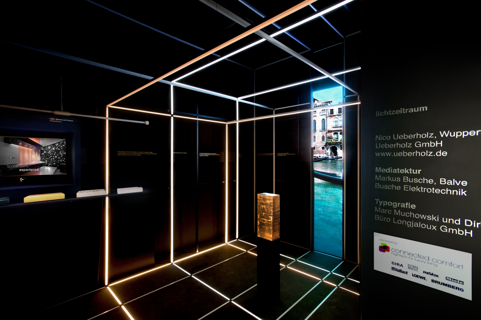 Seit Eröffnung der diesjährigen Architekturausstellung der Biennale in Venedig am 28. Mai 2016, können Besucher ein ganz besonderes Gemeinschaftsprojekt erleben. Über eine 3×5 m große Installation im Palazzo Michele wird unter dem Motto »Raum und Zeit« einem breiten internationalen Fachpublikum aus dem Bereich Architektur und Bau optisch eindrucksvoll demonstriert, wie digitale vernetzte Komfortlösungen Räume per Knopfdruck verwandeln können. Die Installation von Designer und Architekt Nico Ueberholz soll aufzeigen, wie Räume zusätzlich zur dreidimensionalen Raumgestaltung in der Dimension »Zeit« gestaltet, verändert und weiterentwickelt werden können. Tieffrequente Herzschlagtöne werden hierzu mit LED- Lichteffekten aus Kalt- und Warmweiß gekoppelt, um einen Erlebnisraum zu schaffen, in dem Besucher scheinbar in eine andere Zeit- und Raumdimension versetzt werden.