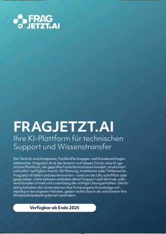 FRAGJETZT.AIIhre KI-Plattform f%u00fcr technischen Support und WissenstransferDie Technik wird komplexer, Fachkr%u00e4fte knapper und Kundenanfragen zahlreicher. FragJetzt.AI ist die Antwort auf diesen Druck: eine KI-gest%u00fctzte Plattform, die gepr%u00fcfte Fachinformationen b%u00fcndelt, strukturiert und sofort verf%u00fcgbar macht. Ob Planung, Installation oder Fehlersuche: FragJetzt.AI liefert pr%u00e4zise Antworten %u2013 rund um die Uhr, schriftlich oder gesprochen. Unternehmen entlasten damit Support und Vertrieb, w%u00e4hrend Kunden schnell und zuverl%u00e4ssig die richtige L%u00f6sung erhalten. Gleichzeitig behalten die Unternehmen ihre firmeneigene Knowledge vollst%u00e4ndig in den eigenen H%u00e4nden, geben nichts davon ab und k%u00f6nnen ihre Wissensdatenbank jederzeit ver%u00e4ndern.Verf%u00fcgbar ab Ende 2025FragJetzt.AI_Launch.indd 1 17.11.25 10:18