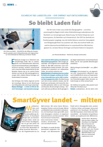 16 5/2025W%u00e4hrend andere noch %u00fcber Energiewende und Konsumentenaufkl%u00e4rung diskutieren, ist SmartGyver l%u00e4ngst dort, wo Entscheidungen fallen: direkt am Point of Sale. Das Magazin, das vor gut zwei Jahren als mutiges Experiment startete, ist heute fixer Bestandteil im Alltag tausender Menschen %u2013 von der Flughafenhalle bis ins Wohnzimmer. Mit seiner klaren Mission, komplexe Themen rund um Energie, W%u00e4rme und Mobilit%u00e4t laienverst%u00e4ndlich aufzubereiten, hat SmartGyver etwas geschafft, woran viele Kampagnen scheitern: Es begeistert Konsumentinnen und Konsumenten. Keine Fachchinesisch-Schlachten, keine technischen H%u00fcrden %u2013 sondern Geschichten, die Lust auf Zukunft machen.Von Beginn an wurde die Idee konsequent umgesetzt: Die Energie- und W%u00e4rmewende findet nicht in Sitzungss%u00e4len statt, sondern in K%u00fcchen, G%u00e4rten und Garagen. Genau dort positioniert sich SmartGyver. Ob Photovoltaik, W%u00e4rmepumpen, Smart Home oder Elektromobilit%u00e4t %u2013 die Redaktion bringt Wissen dorthin, wo es gebraucht wird. W%u00e4hrend anG%u00fcnther Bozic, Marketingleiter bei Stara in Wien, mit SmartGyver am Flughafen Wien-Schwechat: Ein Griff zum Magazin, ein L%u00e4cheln %u2013 und ein klares Zeichen daf%u00fcr, dass Themen wie Energie, W%u00e4rme und Mobilit%u00e4t l%u00e4ngst in der Mitte der Gesellschaft angekommen sind. Foto: SmartGyver-Leser G%u00fcnther BozicSmartGyver landet %u2013 mitten im Leben der Menschen! Bild: SmartGyverSo bleibt Laden fairEICHRECHT BEI LADESTELLEN %u2013 OVE DR%u00c4NGT AUF ENTSCH%u00c4RFUNG:Die Uhr tickt. Ende 2025 endet die %u00dcbergangsfrist %u2013 und ohne praxistaugliche Regeln droht vielen Elektrofahrzeug-Ladestationen die R%u00fcckkehr zur minutengenauen Abrechnung. F%u00fcr Fahrer klingt das nach Intransparenz, f%u00fcr Betreiber nach Kostendruck. Der OVE hat deshalb ein Positionspapier vorgelegt, das die heikle Balance zwischen Genauigkeit und Alltagstauglichkeit neu justieren soll. Was das konkret hei%u00dft und welche %u00fcberraschende Ma%u00dfnahme im verantwortlichen Ministerium geplant ist, verraten Roman Eichinger und Daniel Herbst im Gespr%u00e4ch.Elektrische Energie ist in %u00d6sterreich eine eichpflichtige Gr%u00f6%u00dfe. Wer an Ladestationen nach Kilowattstunden abrechnet, braucht eichrechtskonforme Ladetarifger%u00e4te %u2013 technisch machbar, rechtlich anspruchsvoll und in manchen F%u00e4llen kostenintensiv f%u00fcr den Betreiber. Warum das so ist, welche Fristen dr%u00fccken und wie der OVE praxistaugliche L%u00f6sungen sieht, erkl%u00e4ren Roman Eichinger und Daniel Herbst im Interview. Herr Eichinger, Herr Herbst, beginnen wir bei der Grundlage: Warum ist die Abrechnung nach Kilowattstunden %u00fcberhaupt notwendig?Roman Eichinger %u2013 er leitet im OVE den Bereich Technologie- und Innovationsmanagement sowie die OVE Academy mit zahlreichen Weiterbildungsangeboten: Weil Energie gem%u00e4%u00df Ma%u00df- und Eichgesetz eine eichpflichtige Gr%u00f6%u00dfe ist. Wer kWh verrechnet, muss eichrechtskonforme Ger%u00e4te einsetzen. Das unterscheidet sich wesentlich von zeitbasierten Tarifen, die rechtlich einfacher sind. Daniel Herbstist Projektassistent am Institut f%u00fcr Elektrische Anlagen und Netze der Technischen Universit%u00e4t Graz und im OVE in mehreren Normungsgremien aktiv: Die Abrechnung nach Zeit ist zwar weiterhin erlaubt, aber f%u00fcr Kundinnen und Kunden nicht immer fair. Eine 150-kW-Ladestation liefert je nach Fahrzeug und Situation oft weit weniger Leistung %u2013 dennoch zahlt man pro Minute. Bei AC gen%u00fcgen in der Regel herk%u00f6mmliche eichrechtskonforme Z%u00e4hler, bei DC sind spezielle Messl%u00f6sungen erforderlich. Welche Anlagen sind betroffen %u2013 nur %u201e%u00f6ffentliche%u201c?Eichinger: Entscheidend ist, ob abgerechnet wird. Haupts%u00e4chlich %u00f6ffentliche aber auch halb%u00f6ffentliche (etwa auf Supermarktparkpl%u00e4tzen) oder private (z.B. zum Laden von Firmenfahrzeugen) fallen darunter, sobald Energie an Dritte verkauft wird. Der Zeitdruck ist sp%u00fcrbar. Was passiert nach Ablauf der Frist Ende 2025?Herbst: Ladestationen, die bis dahin nicht NEWS OVEvon Thomas Buchbauer %u2013 Recherche, Konzept und KurationFoto: Adobe Stock/ Wellnhofer Designs Ein E-Auto am Kabel %u2013 Sinnbild f%u00fcr den Alltag der Energiewende: geladen wird in Kilowattstunden, fair abgerechnet nur mit eichkonformer Messung und klaren Tarifen.