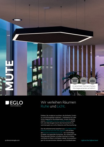 professional.eglo.comWir verleihen R%u00e4umen Ruhe und Licht.Light at the highest levelErleben Sie moderne Leuchten, die %u00c4sthetik, Funktion und Atmosph%u00e4re vereinen %u2013 wahlweise mit oder ohne integrierte Akustikpaneele. Unsere Systeme sind in vielf%u00e4ltigen Formen und RAL-Farben erh%u00e4ltlich und %u00fcberzeugen durch das harmonische Zusammenspiel von Licht, Material und Raumwirkung. Die Akustikelemente bestehen aus recyceltem PETMaterial, sind nach ISO 354 gepr%u00fcft und erf%u00fcllen die Brandschutzklasse B-s2, d0 %u2013 f%u00fcr nachhaltige Qualit%u00e4t und gepr%u00fcfte Sicherheit. Sie verbessern die Raumakustik sp%u00fcrbar, schaffen Klarheit im Klang und Ruhe im Raum und bieten ideale Voraussetzungen f%u00fcr konzentriertes Arbeiten und Wohlbefinden. in verschied. Formen, Farben, Montagevarianten erh%u00e4ltlich LR1078_IMagazin_Mute_A4_GA.indd 1 23/10/2025 16:19:03