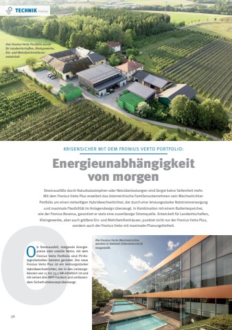 O36 5/2025Energieunabh%u00e4ngigkeit von morgenKRISENSICHER MIT DEM FRONIUS VERTO PORTFOLIO:Stromausf%u00e4lle durch Naturkatastrophen oder Netz%u00fcberlastungen sind l%u00e4ngst keine Seltenheit mehr. Mit dem Fronius Verto Plus erweitert das %u00f6sterreichische Familienunternehmen sein WechselrichterPortfolio um einen vielseitigen Hybridwechselrichter, der durch eine leistungsstarke Notstromversorgung und maximale Flexibilit%u00e4t im Anlagendesign %u00fcberzeugt. In Kombination mit einem Batteriespeicher, wie der Fronius Reserva, garantiert er stets eine zuverl%u00e4ssige Stromquelle. Entwickelt f%u00fcr Landwirtschaften, Kleingewerbe, aber auch gr%u00f6%u00dfere Ein- und Mehrfamilienh%u00e4user, punktet nicht nur der Fronius Verto Plus, sondern auch der Fronius Verto mit maximaler Planungsfreiheit. Ob Stromausfall, steigende Energiepreise oder volatile Netze, mit dem Fronius Verto Portfolio sind PV-Anlagenbetreiber bestens ger%u00fcstet. Der neue Fronius Verto Plus ist ein leistungsstarker Hybridwechselrichter, der in den Leistungsklassen von 15 bis 33,3 kW erh%u00e4ltlich ist und mit seinen drei MPP-Trackern und umfassendem Sicherheitskonzept %u00fcberzeugt.Die Fronius Verto Wechselrichter werden in Sattledt (Ober%u00f6sterreich) hergestellt.Fotos: Fronius International GmbHDas Fronius Verto Portfolio wurde f%u00fcr Landwirtschaften, Kleingewerbe, Ein- und Mehrfamilienh%u00e4user entwickelt. TECHNIK Fronius