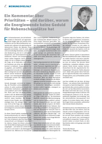5/2025 5 MEINUNGSVIELFALTEin Kommentar %u00fcber Priorit%u00e4ten %u2013 und dar%u00fcber, warum die Energiewende keine Geduld f%u00fcr Nebenschaupl%u00e4tze hatEs ist bemerkenswert, wie viel Aufmerksamkeit in %u00d6sterreich auf organisatorische Fragen oder die Internas einer Institution wie der Wirtschaftskammer verwendet wird, w%u00e4hrend sich gleichzeitig die tektonischen Platten der globalen Energiepolitik verschieben. Und ich meine das nicht als beil%u00e4ufige Randnotiz, sondern als eine Beobachtung, die mir in zahlreichen Gespr%u00e4chen mit UnternehmerInnen, Installateuren, Planern und Energieexperten immer wieder begegnet. Genau deshalb stellte ich mir zu Beginn dieser Ausgabe die Frage, ob es klug w%u00e4re, mich erneut mit Strukturen wie jenen der Wirtschaftskammer zu befassen. Kooperationen hat es gegeben, und zweifellos wurden in der Vergangenheit sinnvolle Initiativen gesetzt. Aber es dr%u00e4ngt sich auf, dass der praktische Nutzen solcher Strukturen f%u00fcr die gro%u00dfen energie- und industriepolitischen Herausforderungen unserer Zeit immer schwerer zu erkennen ist.Gerade deswegen erscheint es notwendig, die Priorit%u00e4ten unmissverst%u00e4ndlich zu ordnen. Es wirkt zunehmend sinnvoll, bei bestimmten Institutionen gedanklich und auch praktisch rasch einen Schnitt zu ziehen. Nicht, weil man sie gering sch%u00e4tzt, sondern weil die Wirklichkeit uns zwingt, Ressourcen dort einzusetzen, wo sie tats%u00e4chlich etwas bewirken. Die Energiewende ist kein Projekt, das sich nebenbei erledigen l%u00e4sst. Sie verlangt Fokus %u2013 und zwar nicht auf die Frage, wer welchen Ausschuss besetzt, sondern darauf, wie wir die technologische und wirtschaftliche Zukunft Europas sichern.Zu dieser Zukunft geh%u00f6rt unweigerlich die Auseinandersetzung mit seltenen Erden. Dass diese Elemente nicht geologisch %u201eselten%u201c sind, ist bekannt; dass ihre Gewinnung anspruchsvoll und %u00f6kologisch belastend ist, ebenso. Europa hat diesen unbequemen Teil der Wertsch%u00f6pfung jahrzehntelang ausgelagert %u2013 und merkt nun schmerzhaft, wie sehr es sich damit in die Abh%u00e4ngigkeit man%u00f6vriert hat. W%u00e4hrend wir hierzulande %u00fcber Zust%u00e4ndigkeiten, Verfahrensfragen oder institutionelle Abl%u00e4ufe beraten, hat China l%u00e4ngst Tatsachen geschaffen. Das Land produziert, verarbeitet und kontrolliert den %u00fcberwiegenden Teil jener Materialien, die wir f%u00fcr Motoren, Windkraftanlagen, Mikroelektronik und Hochtechnologie ben%u00f6tigen. Die j%u00fcngsten Ausfuhrkontrollen sind daher weniger ein politisches Man%u00f6ver als eine Erinnerung: Wer wesentliche Rohstoffe nicht selbst beherrscht, verliert Gestaltungsmacht.Gleichzeitig entwickelt sich die Technologie weiter %u2013 schneller, als es in manchen politischen Prozessen abgebildet wird. Motoren ohne Seltenerdmetalle sind l%u00e4ngst Realit%u00e4t. Redesigns mit reduzierten Materialbedarfen sind in Entwicklung. Recycling gewinnt an industrieller Qualit%u00e4t. Europa ist nicht ohnm%u00e4chtig, sondern maximal schlecht koordiniert. Wenn wir diese Alternativen ernsthaft verfolgen, k%u00f6nnen wir die Abh%u00e4ngigkeiten Schritt f%u00fcr Schritt reduzieren. Aber das gelingt nur, wenn wir uns nicht st%u00e4ndig in strukturellen Nebenfragen verzetteln, sondern endlich beginnen, strategisch zu denken und zu handeln.Dabei geraten wir unweigerlich zu jenen Abh%u00e4ngigkeiten, die unser System am st%u00e4rksten pr%u00e4gt: Erd%u00f6l und Gas. Sie bestimmen Mobilit%u00e4t, Industrie und W%u00e4rmeversorgung, und sie machen Europa politisch vulnerabel. Die L%u00f6sung ist weder neu noch spektakul%u00e4r, aber sie ist zwingend: die Elektrifizierung aller wesentlichen Sektoren. Das ist der Weg zu Stabilit%u00e4t, Versorgungssicherheit und %u00f6konomischer Vernunft. Doch er funktioniert nur, wenn wir ein Stromsystem aufbauen, das diesen Wandel tr%u00e4gt %u2013 ein System, das nicht durch Fehlanreize ausgebremst wird, sondern durch kluge Rahmenbedingungen beschleunigt.Genau daran entscheidet sich viel, und genau deshalb ist das %u00f6sterreichische Elektrizit%u00e4tswirtschaftsgesetz (ElWG) ein so entscheidender Hebel. Der zuletzt diskutierte Entwurf mit zus%u00e4tzlichen Netzentgelten f%u00fcr Einspeiser zeigt eine Tendenz, die irritiert: Er k%u00f6nnte jene Investitionen erschweren, die wir dringend ben%u00f6tigen. Eine Energiewende, die den Zufluss erneuerbarer Energie verteuert, scheitert an sich selbst. Es w%u00e4re w%u00fcnschenswert, dass Regulierung und Politik die Dynamik des Systems nicht als St%u00f6rfaktor, sondern als Chance begreifen.Zu diesen Chancen geh%u00f6rt in besonderem Ma%u00df das bidirektionale Laden. Elektroautos als mobile Speicher sind keine Zukunftsvision mehr, sondern gelebte Realit%u00e4t dort, wo man sie zul%u00e4sst. Sie k%u00f6nnten Netze stabilisieren, Lastspitzen abfedern, erneuerbaren Strom besser nutzbar machen. Deutschland hat den regulatorischen Einstieg gewagt. %u00d6sterreichs Politik diskutiert noch. Dabei w%u00e4re gerade diese Technologie ein logischer Baustein eines modernen Energiesystems, das auf Flexibilit%u00e4t und Dezentralit%u00e4t setzt.Und hier schlie%u00dft sich der Kreis. All diese Themen %u2013 von seltenen Erden %u00fcber Elektrifizierung bis zu Speicherintegration %u2013 verlangen Klarheit, Mut und eine politische Kultur, die sich auf das Wesentliche konzentriert. Wir haben nicht mehr den Luxus, uns langfristige Ablenkungen leisten zu k%u00f6nnen. Der technologische Umbruch ist da, die geopolitischen Realit%u00e4ten sind eindeutig, und die wirtschaftlichen Konsequenzen sind sp%u00fcrbar. Es ist keine Option mehr, die gro%u00dfen Fragen hinten anzustellen, w%u00e4hrend wir %u00fcber formale Details diskutieren.Deshalb braucht es eine Debattenkultur, die den Blick hebt. Eine, die erkennt, dass die Zukunft unseres Energiesystems nicht davon abh%u00e4ngt, wie wir Institutionen verwalten und wer ihnen vorstehen soll, sondern davon, ob wir bereit sind, technologisch und poli
