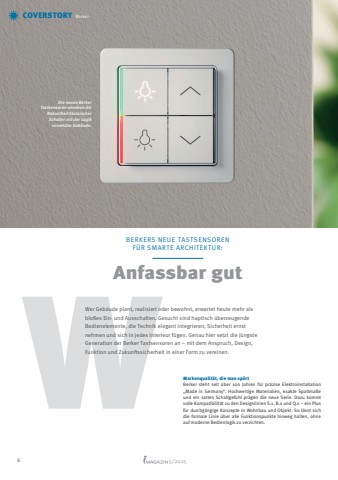 6 5/2025BERKERS NEUE TASTSENSOREN F%u00dcR SMARTE ARCHITEKTUR:Anfassbar gutWWer Geb%u00e4ude plant, realisiert oder bewohnt, erwartet heute mehr als blo%u00dfes Ein- und Ausschalten. Gesucht sind haptisch %u00fcberzeugende Bedienelemente, die Technik elegant integrieren, Sicherheit ernst nehmen und sich in jedes Interieur f%u00fcgen. Genau hier setzt die j%u00fcngste Generation der Berker Tastsensoren an %u2013 mit dem Anspruch, Design, Funktion und Zukunftssicherheit in einer Form zu vereinen.Markenqualit%u00e4t, die man sp%u00fcrtBerker steht seit %u00fcber 100 Jahren f%u00fcr pr%u00e4zise Elektroinstallation %u201eMade in Germany%u201c. Hochwertige Materialien, exakte Spaltma%u00dfe und ein sattes Schaltgef%u00fchl pr%u00e4gen die neue Serie. Dazu kommt volle Kompatibilit%u00e4t zu den Designlinien S.1, B.x und Q.x %u2013 ein Plus f%u00fcr durchg%u00e4ngige Konzepte in Wohnbau und Objekt. So l%u00e4sst sich die formale Linie %u00fcber alle Funktionspunkte hinweg halten, ohne auf moderne Bedienlogik zu verzichten.COVERSTORY BerkerDie neuen Berker Tastsensoren vereinen die Robustheit klassischer Schalter mit der Logik vernetzter Geb%u00e4ude.