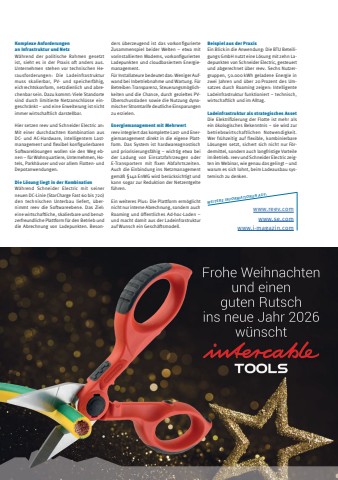 Komplexe Anforderungen an Infrastruktur und NetzW%u00e4hrend der politische Rahmen gesetzt ist, sieht es in der Praxis oft anders aus. Unternehmen stehen vor technischen Herausforderungen: Die Ladeinfrastruktur muss skalierbar, PV- und speicherf%u00e4hig, eichrechtskonform, netzdienlich und abrechenbar sein. Dazu kommt: Viele Standorte sind durch limitierte Netzanschl%u00fcsse eingeschr%u00e4nkt %u2013 und eine Erweiterung ist nicht immer wirtschaftlich darstellbar.Hier setzen reev und Schneider Electric an: Mit einer durchdachten Kombination aus DC- und AC-Hardware, intelligentem Lastmanagement und flexibel konfigurierbaren Softwarel%u00f6sungen wollen sie den Weg ebnen %u2013 f%u00fcr Wohnquartiere, Unternehmen, Hotels, Parkh%u00e4user und vor allem Flotten- und Depotanwendungen.Die L%u00f6sung liegt in der KombinationW%u00e4hrend Schneider Electric mit seiner neuen DC-Linie (StarCharge Fast 60 bis 720) den technischen Unterbau liefert, %u00fcbernimmt reev die Softwareebene. Das Ziel: eine wirtschaftliche, skalierbare und benutzerfreundliche Plattform f%u00fcr den Betrieb und die Abrechnung von Ladepunkten. Besonders %u00fcberzeugend ist das vorkonfigurierte Zusammenspiel beider Welten %u2013 etwa mit vorinstallierten Modems, vorkonfigurierten Ladepunkten und cloudbasiertem Energiemanagement.F%u00fcr Installateure bedeutet das: Weniger Aufwand bei Inbetriebnahme und Wartung. F%u00fcr Betreiber: Transparenz, Steuerungsm%u00f6glichkeiten und die Chance, durch gezieltes PV%u00dcberschussladen sowie die Nutzung dynamischer Stromtarife deutliche Einsparungen zu erzielen.Energiemanagement mit Mehrwertreev integriert das komplette Last- und Energiemanagement direkt in die eigene Plattform. Das System ist hardwareagnostisch und priorisierungsf%u00e4hig %u2013 wichtig etwa bei der Ladung von Einsatzfahrzeugen oder E-Transportern mit fixen Abfahrtszeiten. Auch die Einbindung ins Netzmanagement gem%u00e4%u00df %u00a714a EnWG wird ber%u00fccksichtigt und kann sogar zur Reduktion der Netzentgelte f%u00fchren.Ein weiteres Plus: Die Plattform erm%u00f6glicht nicht nur interne Abrechnung, sondern auch Roaming und %u00f6ffentliches Ad-hoc-Laden %u2013 und macht damit aus der Ladeinfrastruktur auf Wunsch ein Gesch%u00e4ftsmodell.Beispiel aus der PraxisEin Blick in die Anwendung: Die BTU Beteiligungs GmbH nutzt eine L%u00f6sung mit zehn Ladepunkten von Schneider Electric, gesteuert und abgerechnet %u00fcber reev. Sechs Nutzergruppen, 50.000 kWh geladene Energie in zwei Jahren und %u00fcber 20 Prozent des Umsatzes durch Roaming zeigen: Intelligente Ladeinfrastruktur funktioniert %u2013 technisch, wirtschaftlich und im Alltag.Ladeinfrastruktur als strategisches AssetDie Elektrifizierung der Flotte ist mehr als ein %u00f6kologisches Bekenntnis %u2013 sie wird zur betriebswirtschaftlichen Notwendigkeit. Wer fr%u00fchzeitig auf flexible, kombinierbare L%u00f6sungen setzt, sichert sich nicht nur F%u00f6rdermittel, sondern auch langfristige Vorteile im Betrieb. reev und Schneider Electric zeigten im Webinar, wie genau das gelingt %u2013 und warum es sich lohnt, beim Ladeausbau systemisch zu denken.www.reev.com www.se.comwww.i-magazin.comWEITERE INFORMATIONEN AUF:Prosit Neujahr!