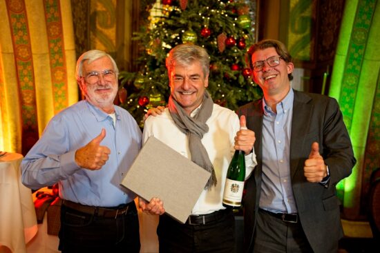 Ernst Gmeiner (Mitte) bei der Übergabe seines Abschiedsgeschenks mit Ted Naimer (links) und Laurent Groothaert (rechts) (Bild: Kraus & Naimer)