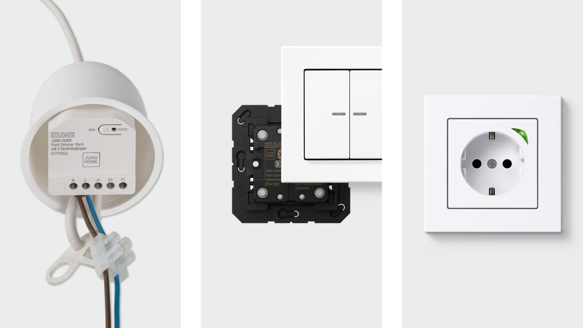 Bestehende 230-V-Installationen in Wohnungen oder Eigenheimen lassen sich mit den Jung Home Pucks gezielt erweitern, ohne neue Leitungen, Server oder Internet. Die kompakten Aktoren werden direkt in der Gerätedose, im Leuchtenbaldachin oder in der Zwischendecke installiert und vernetzen sich lokal über Bluetooth Mesh. So entsteht modular und flexibel eine intelligente Lichtsteuerung.