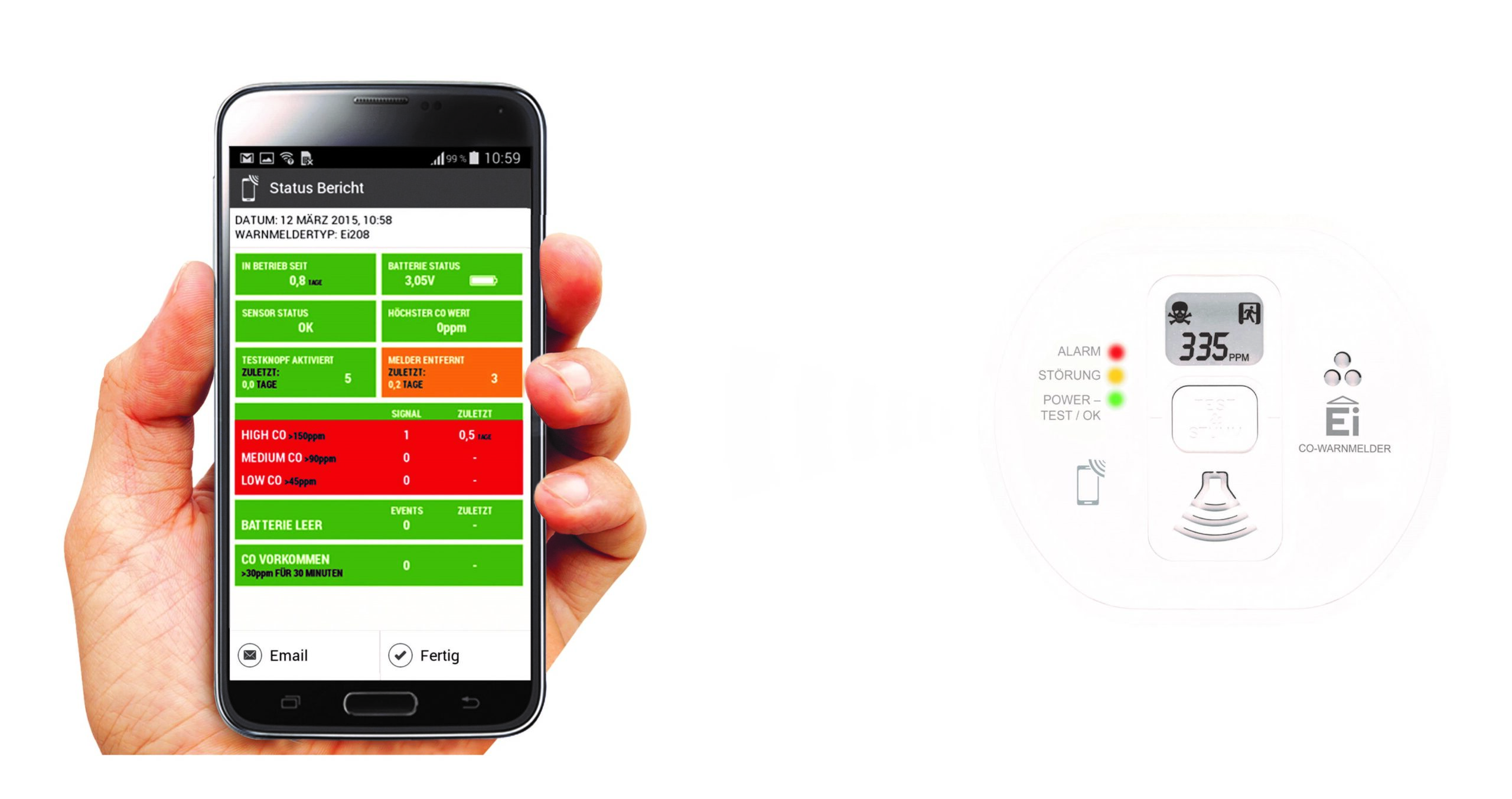 Der Kohlenmonoxidwarnmelder Ei208iDW warnt zuverlässig vor gesundheitsgefährdenden Konzentrationen des Atemgifts, das vom Menschen nicht wahrgenommen werden kann. Der Ereignisspeicher lässt sich mit der Audiolink-Technologie bequem vor Ort über ein Smartphone auslesen. Damit können auch solche Vorfälle rechtzeitig erkannt werden, bei denen Kohlenmonoxid unbemerkt in kleineren Mengen über einen längeren Zeitraum austritt. Der nach EN 50291 Teil 1 und 2 geprüfte Melder besitzt ein LCD-Display, das die gemessene Gaskonzentration in ppm anzeigt. Die Lebensdauer des Ei208iDW beträgt einschließlich elektrochemischem Sensor und Langzeit-Lithiumbatterie mindestens zehn Jahre.