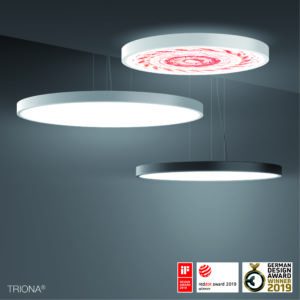 Dank seitlicher Lichteinkopplung spendet Triona verblüffend gleichmäßiges, blendfreies Licht und ist auch als Version mit zusätzlichem indirekten Lichtaustritt verfügbar. Mit drei Durchmessern, drei Sichtfarben und drei verschiedenen Diffusor-Ausführungen, darunter auch eine Versionen mit UGR ≤ 19 und aus edlem Muranoglas, wird die progressive Decken-, Wand- oder Pendelleuchte den unterschiedlichsten Anforderungen und Einsatzbereichen gerecht. Gleich drei Designpreise machen die Trilogie komplett: 2019 erhielt die Serie Triona den German Design Award sowie den iF- und den reddot-Produkt Design Award.