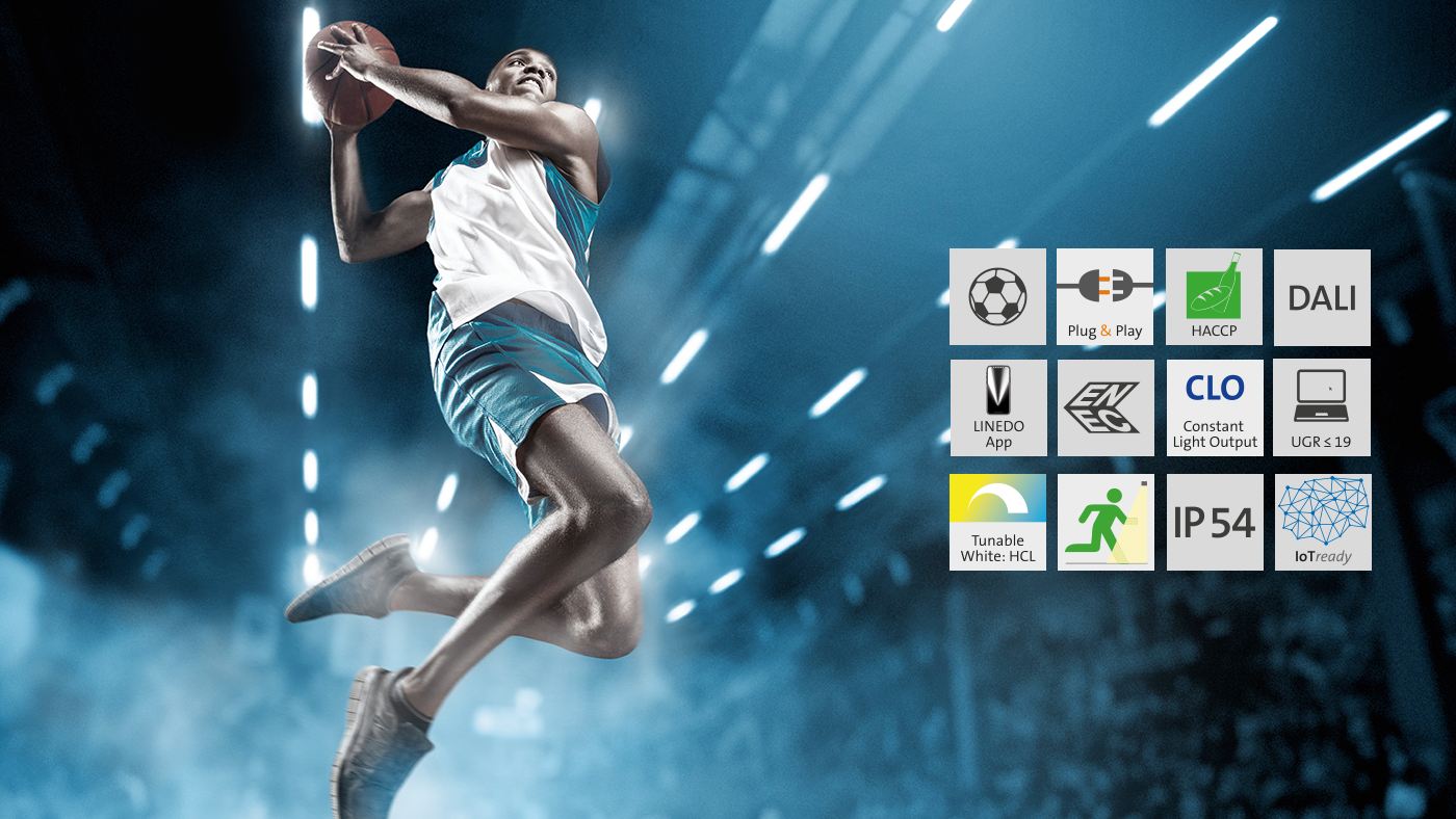 Neben Modulen mit Light Case Hallenstrahlern ermöglicht Linedo mittels Universaladapter die Integration anderer Leuchtentypen. Durch entsprechendes Zubehör lassen sich Linedo Lichtbänder ballwurfsicher ausbilden.