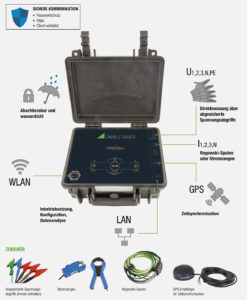 Der LINAX PQ5000 MOBILE wird in einem robusten und wasserdichten Gehäuse verbaut und ist abschließbar. Die jeweilige Strom-Messung erfolgt entweder über ein Stromzangenset oder Rogowoski-Spulen. Dabei wird die Spannung direkt über abgesicherte Spannungsabgriffe gemessen. Als Option kann zusätzlich eine GPS-Zeitsynchronisation bestellt werden, um im Feld die Messdaten mit dem korrekten Zeitstempel abzubilden.