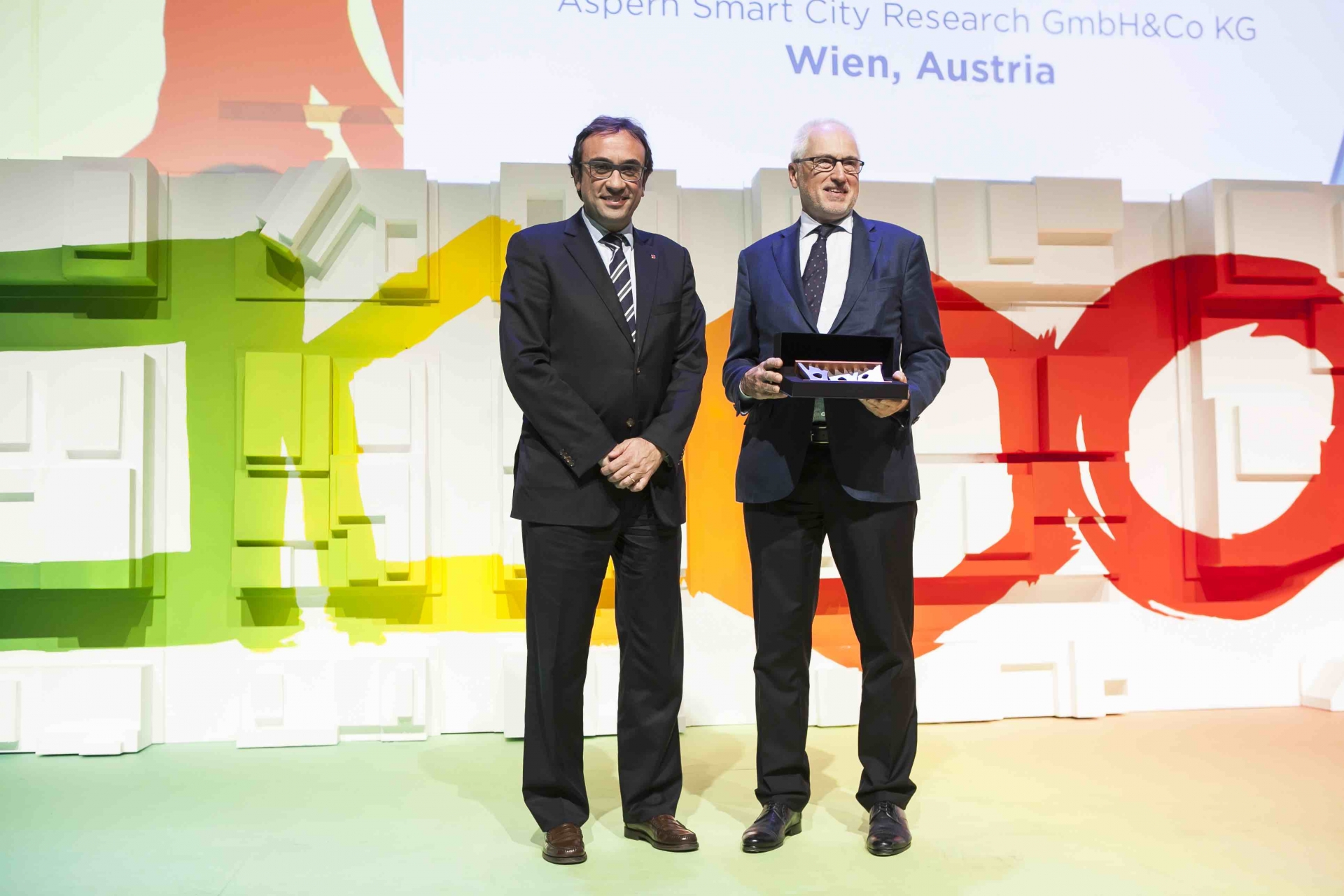 Die Aspern Smart City Research überzeugte die internationale Jury als bestes umgesetztes Projekt. Der Ansatz, alle Komponenten im Energiesystem – nämlich Gebäude, Netz, NutzerInnen und Informations- und Kommunikationstechnologien – miteinzubeziehen und so an einer effizienten und CO2–armen Energiezukunft zu arbeiten, überzeugte die internationale Jury. Stellvertretend für das Team der ASCR nahm Geschäftsführer Reinhard Brehmer den Preis in Barcelona entgegen.
