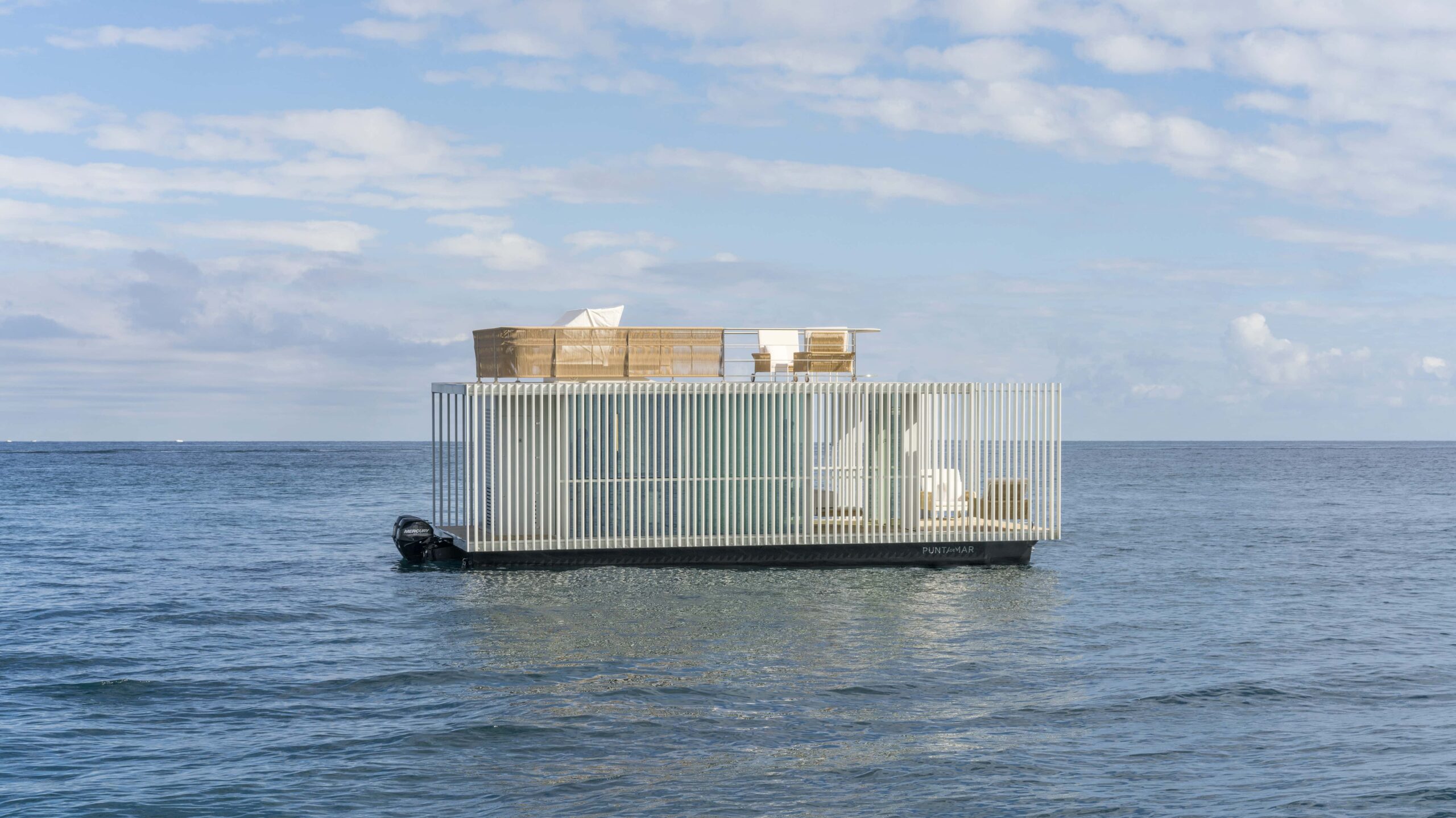 Punta de Mar ist von einer vertikalen Lamellenwand umgeben, die Licht durchlässt. Auf zwei Ebenen haben die Gäste insgesamt 74 m² zur Verfügung. In der unteren Etage befindet sich neben einer Kabine mit Bad eine Terrasse, die an den Innenraum angrenzt. Selbstverständlich können die Urlauber auf dem Wasser übernachten. Vom Bett aus ist der Blick auf das Meer garantiert. Der zweite Stock dient als Entspannungs-Deck. Die Möblierung wurde auf die Farbe der Lamellen abgestimmt. Beim Design und der Ausstattung legte das Architektenteam sehr viel Wert auf Minimalismus. Dennoch steckt in dieser Reduzierung ein Hauch von Exklusivität. Der wahre Luxus liegt in der Nähe zur Natur: Alle verwendeten Materialien sind umweltfreundlich und nachhaltig.