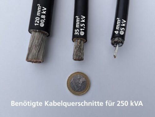 Die Erhöhung der Spannung reduziert die Kabelquerschnitte und damit den Kupferbedarf erheblich. (© Fraunhofer ISE)