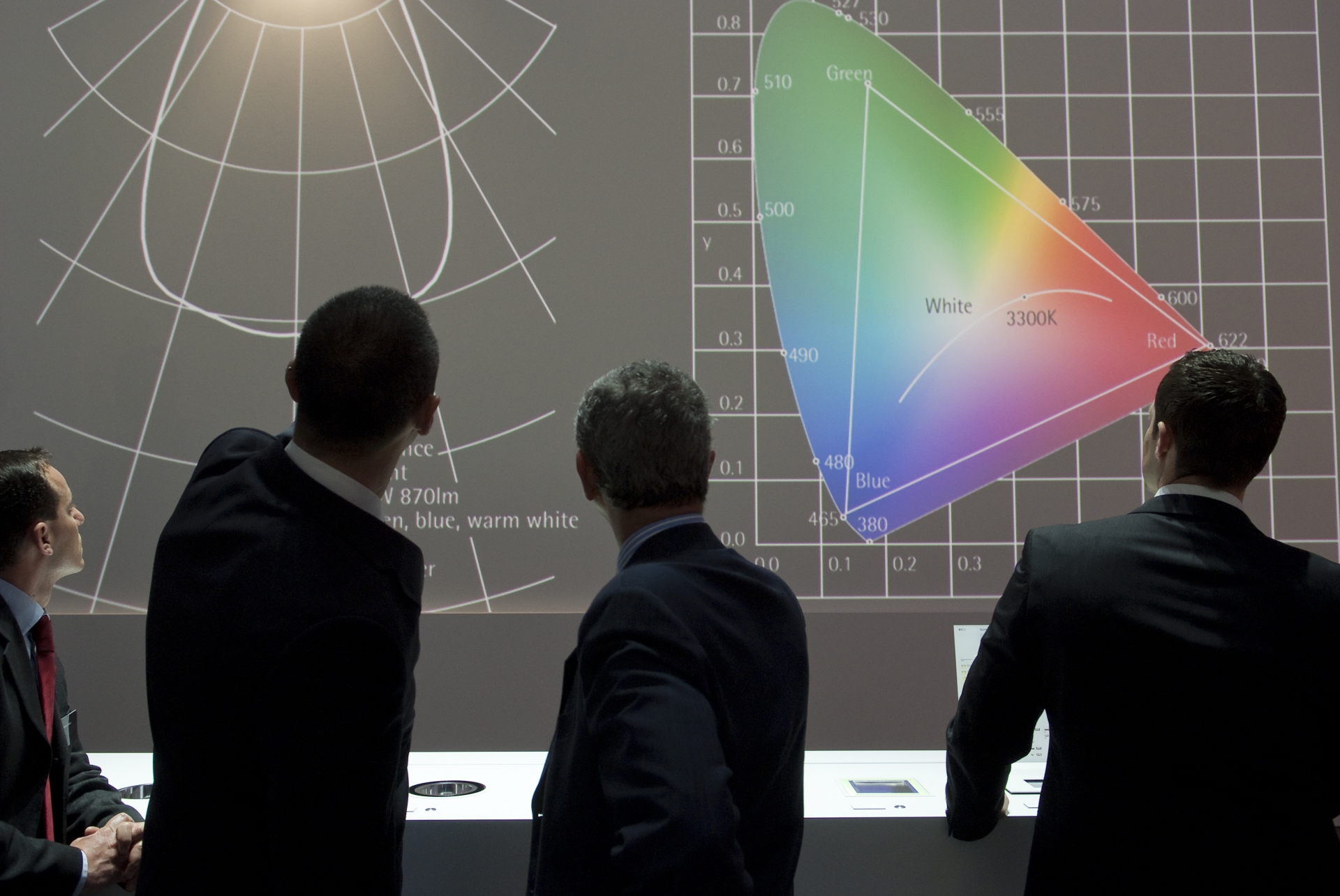 Die RGBW-Produkte von Erco enthalten zudem eine patentierte Farbsteuerung, welche die Toleranzen der LEDs kompensiert. Damit wird garantiert, dass alle RGBW-Leuchten exakt dieselbe Farbe liefern, wenn sie ein entsprechendes Steuerungssignal erhalten. Im Vergleich zu anderen Systemen wie beispielsweise tuneable White bietet RGBW somit den maximalen und einstellbaren Color Rendering Index (CRI) – so kann z.B. eine weiße Farbe 3.500 K mit max. CRI oder mit der Betonung einer anderen Farbe (rot) gemischt werden. Bei einer Mischung von 2.500 K und 5.500 K wären hingegen alle Farbtöne farbstichig (i.d.R. pink) und auch der Lichtstrom müsste mit hohem Aufwand neu eingestellt werden.