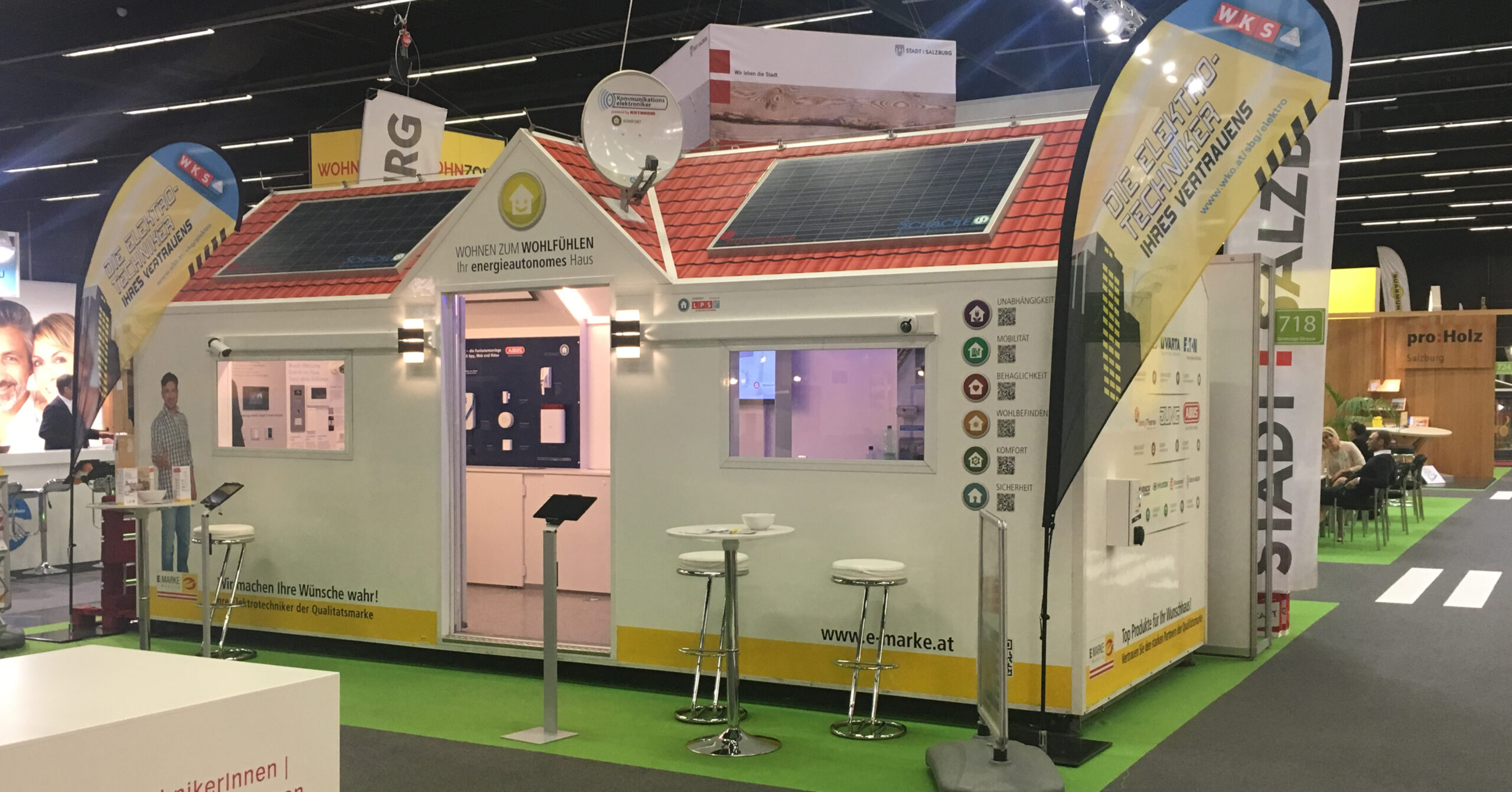 Die Elektrotechniker waren neben dem Land Salzburg, der FH Salzburg, der Energieberatung Salzburg, den Salzburger Baumeistern, der Architektenkammer und ProHolz Salzburg, Teil der Beratungsstraße. In dieser Beratungsstraße konnten sich Interessierte unter anderem über das Thema Smart Home informieren. Der Elektrotechniker ist dabei für die gesamte Haustechnik von der Planung bis zur Realisierung eines neuen Zuhauses zuständig. Es wurde auch auf die unterschiedlichen Leistungen und technischen Neuerungen in der Branche aufmerksam gemacht, wie die Infrarot-Heizung, Elektro-Fußbodenheizungen, Flächenheizungen allgemein, PV-Anlagen, Elektro-Speicher uvm.