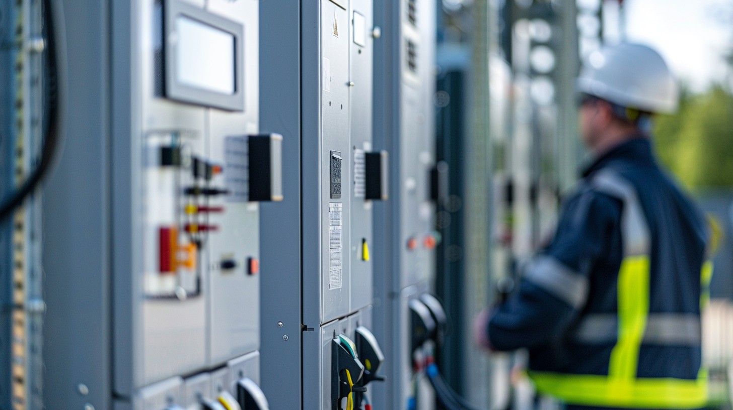 Eine moderne elektrische Schaltanlage im Verteilnetz steht im Vordergrund, ein Techniker mit Helm ist im Hintergrund unscharf.