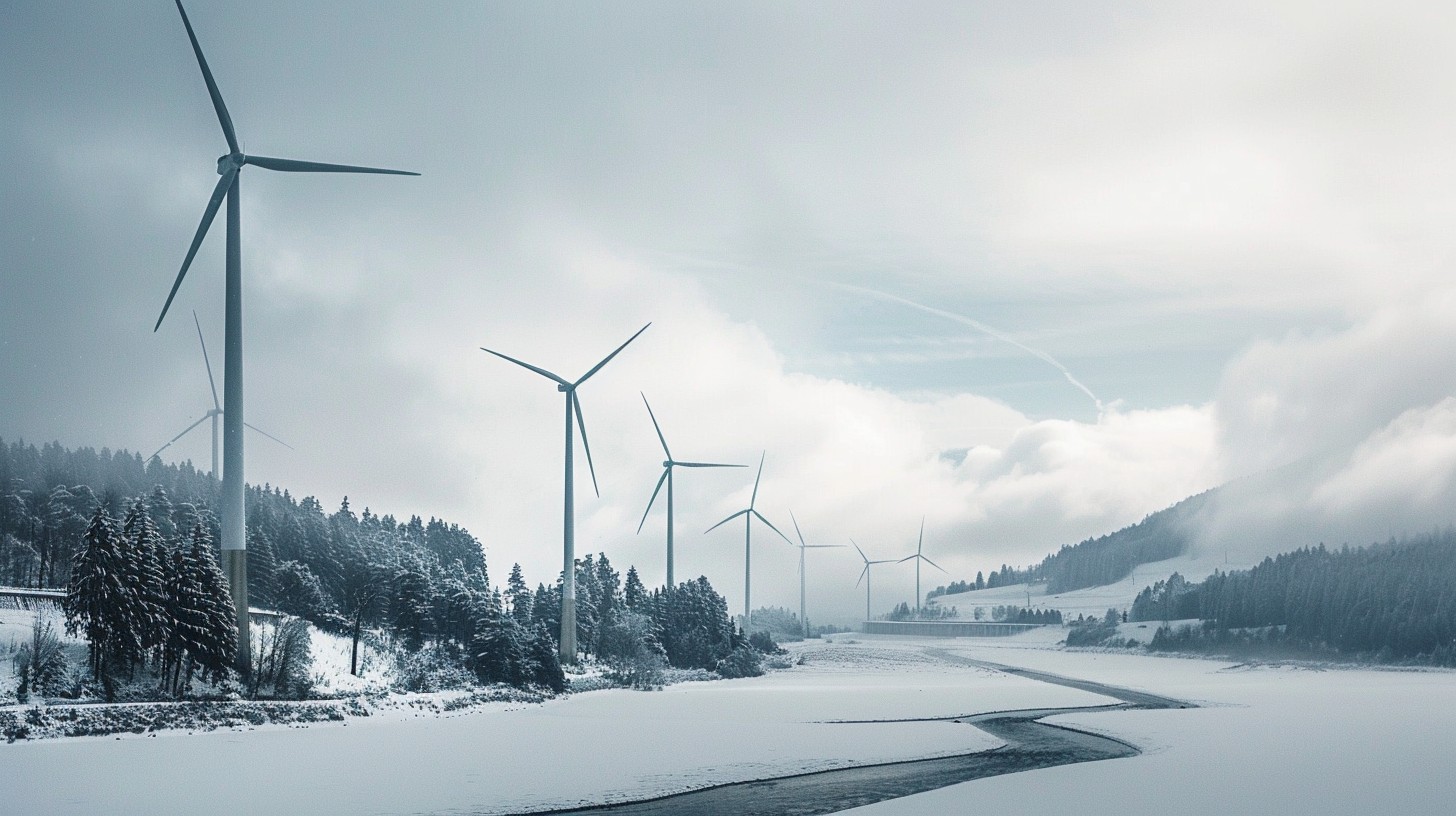 Windkraftanlagen in winterlicher Landschaft – Wind wird im Zielbild 2040 als zentraler Hebel zur Schließung der Winterstromlücke beschrieben. (©www.i-magazin.com / auf Midjourney erstellt.)
