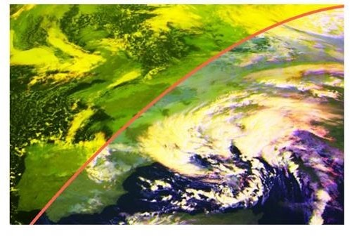 Satellitenaufnahme über Europa zum Sonnenaufgang, hier mit sichtbarem und Infrarot Kanal. (© Fraunhofer ISE)