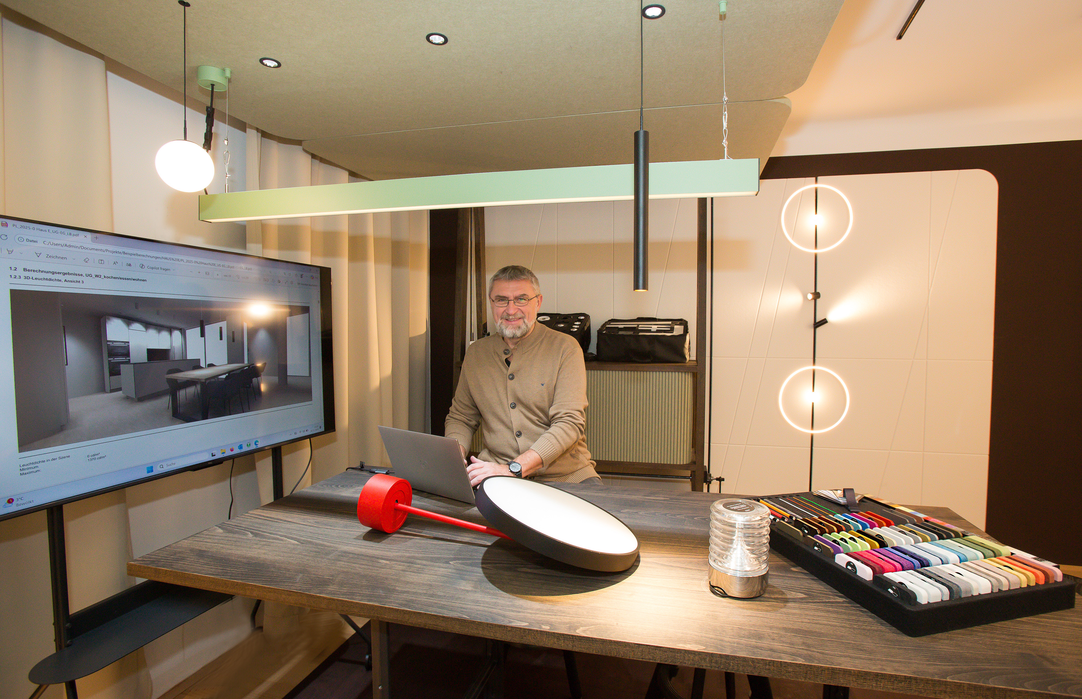 Ipsmiller: Weil Licht immer im Kontext wirkt. Wir halten diese Materialien ins Licht, vergleichen Farbtemperaturen, beurteilen Farbwiedergabe. Gerade bei Holz, Textilien oder Akustikflächen ist das enorm wertvoll. Planung wird dadurch ganzheitlich – nicht fragmentiert.