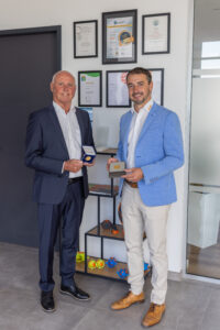 Vater und Ideengeber Herbert Wintersteiger (l.) sowie Geschäftsführender Gesellschafter Thomas Wintersteiger mit den Auszeichnungen für innovative Produkte. (Bild: Primo GmbH)